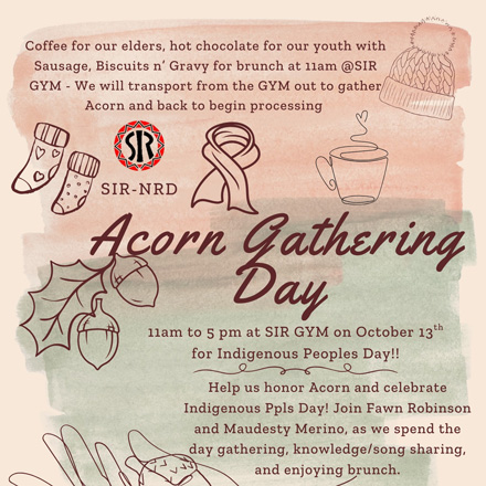 Join the Susanville Indian Rancheria for a special Acorn Gathering Day on Monday, October 13th, from 11:00a.m. to 5:00p.m. at the SIR Gym to celebrate Indigenous Peoples Day.