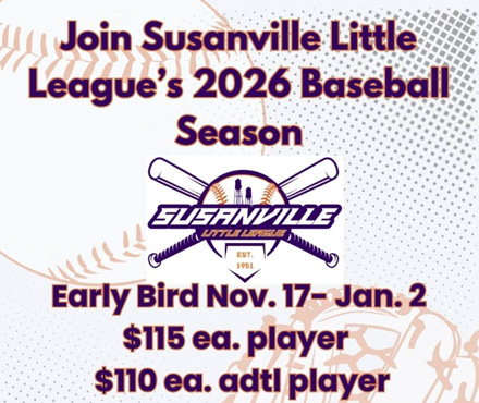 Early bird online registration for Susanville Little League’s 2026 season and if you sign up beginning November 17th you can save money! Register before January 2nd, to get the discount.