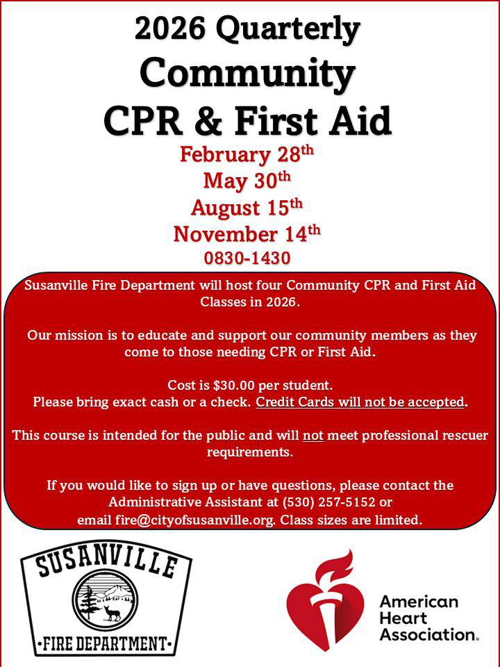 Susanville Fire Department will host four Community CPR and First Aid Classes in 2026.