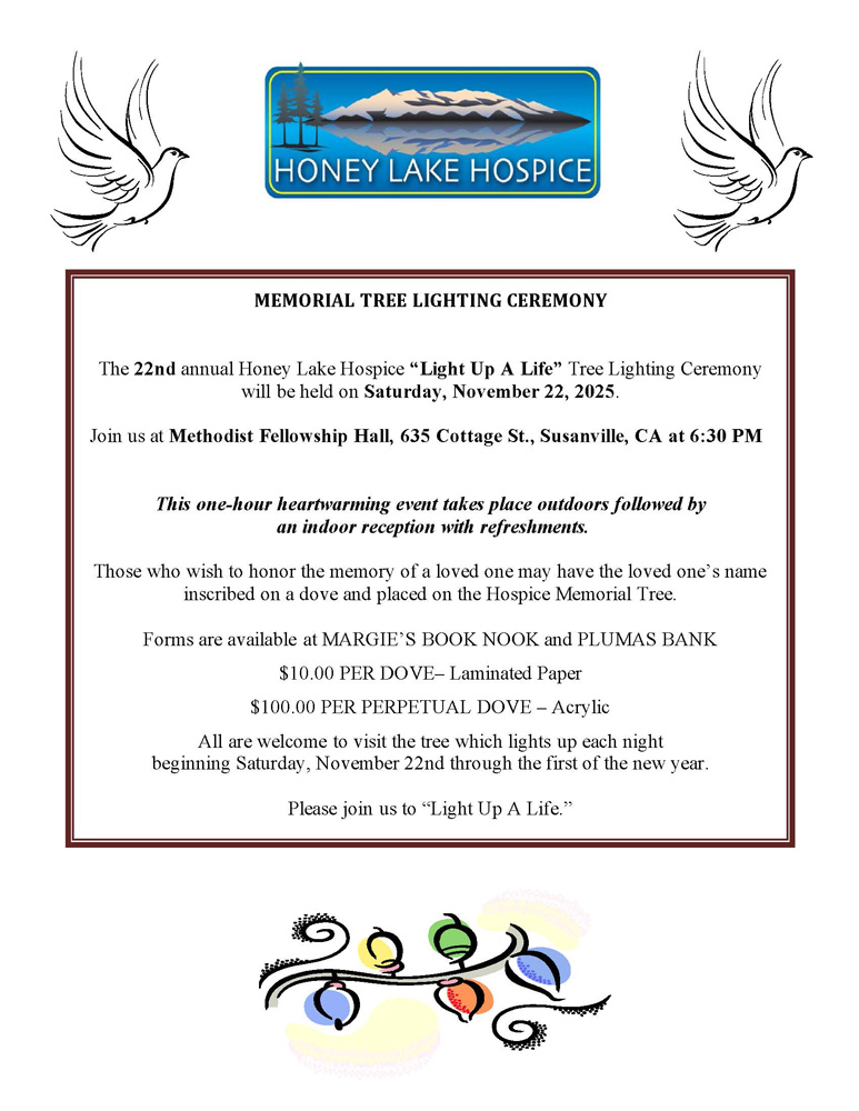 The 22nd annual Honey Lake Hospice “Light Up A Life” Tree Lighting Ceremony will be held on Saturday, November 22, 2025.
