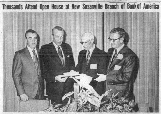 Johnston, top photo, at right, is shown displaying the key to three former Susanville branch managers who were present for the occasion. They are, from left, Jack Norwood, now manager of the bank’s branch at Selma, Winston Nichols, bank vice president with the regional loan administration in the San Francisco main office, and Charles H. Bridges, Susanville.