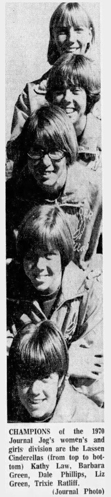 Winner of the division, 18-year-old Kathy Law, who was a close runner-up in last year’s Journal Jog while a senior at Lassen High School in Susanville, said, “I enjoy running. You meet lots of people. It’s the only competition for girls in Susanville.”