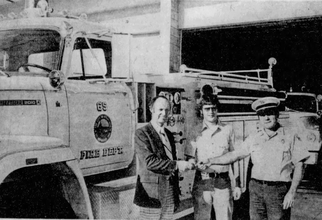 ADDED FIRE PROTECTION—Don Morrison, left, manager of the local United California Bank branch, last Friday presented the keys to a new fire truck the city acquired with UCB financing to Susanville Mayor Jim Chapman and Fire Chief Ray Berettini.